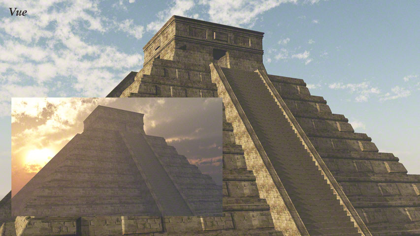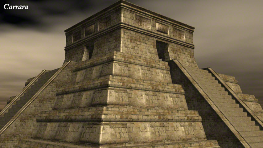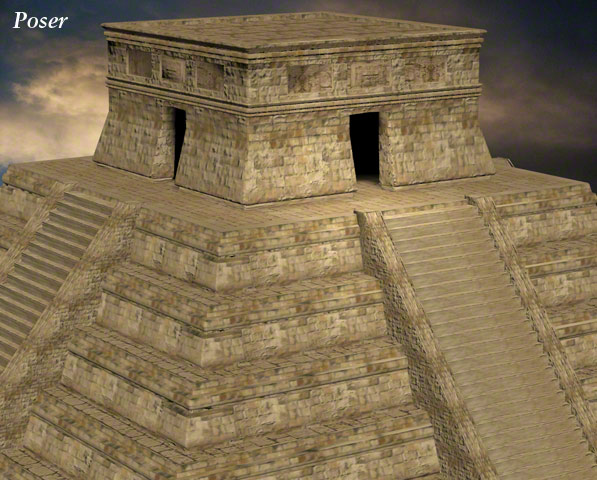 This Mayan style pyramid was made in Carrara for one of my own pictures: 'Discovering New Gods' – Seen in the Human Gallery. It was once offered as a free gift to newsletter subscribers in .obj format so it could be imported into many programs, such as Daz|Studio, Bryce, Carrara, Poser and Vue etc. These example renders are produced in varying programs.